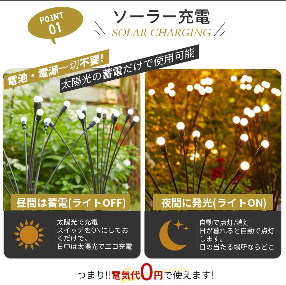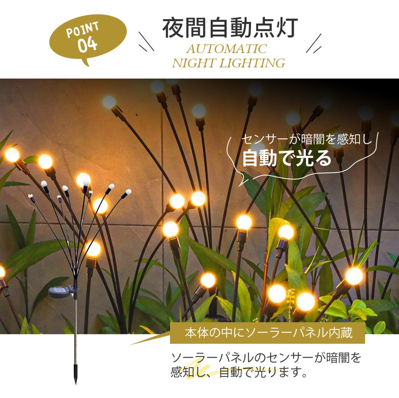 4個入れのソーラーガーデンライトは光透過率の高いPVC球体や柔軟な枝で作られ、暖かいホタル発光効果のデザインを施して、夜に風が吹くとホタルライトが揺れて、その踊る美しさは美しい夜景を作り出します。